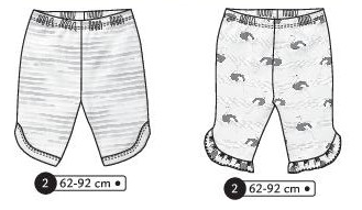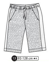 Pantacourt avec ouverture arrondie sur les côtés extérieurs du bas des jambes, avec ou sans volant. Taille élastiquée