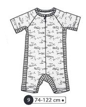 Combinaison de plage et baignade . Manches courtes raglans et jambes courtes, bandes sous les manches et côtés et entrejambe. Fermeture invisible devant